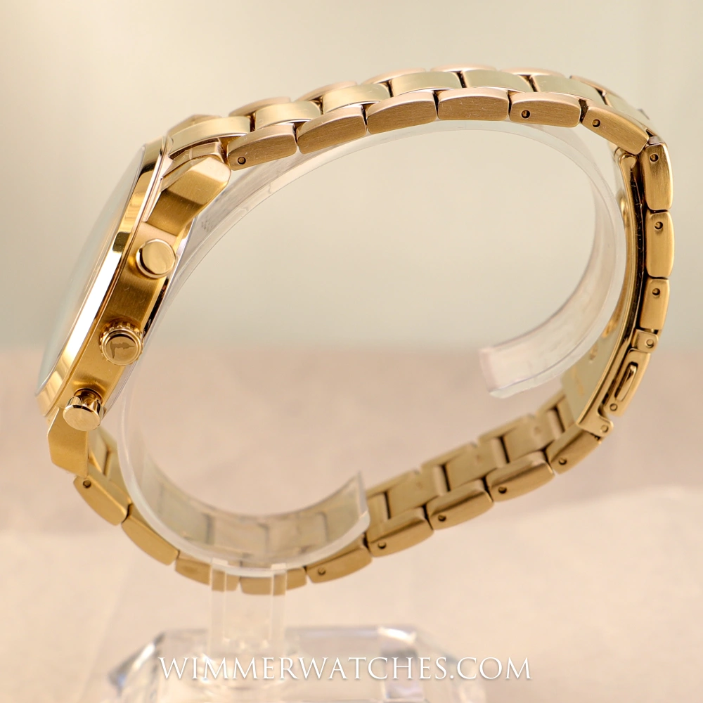 - Armband: Goldfarbenes Edelstahlarmband (Breite: 2 cm), mit Faltschließe